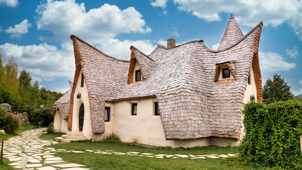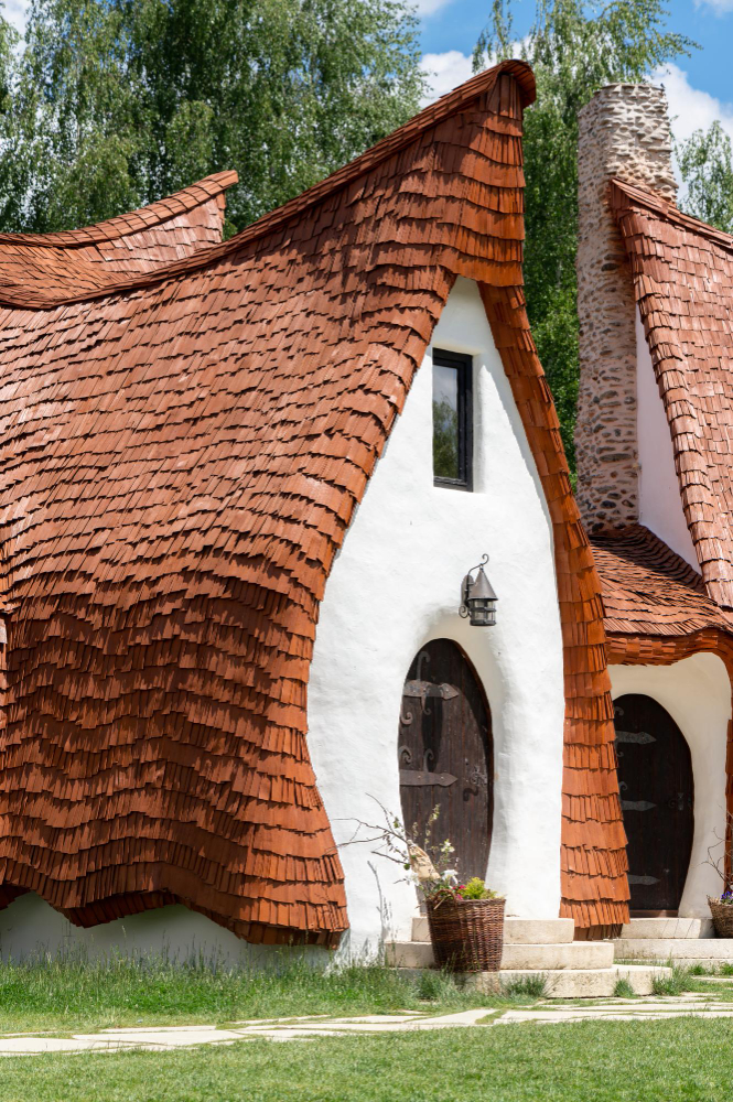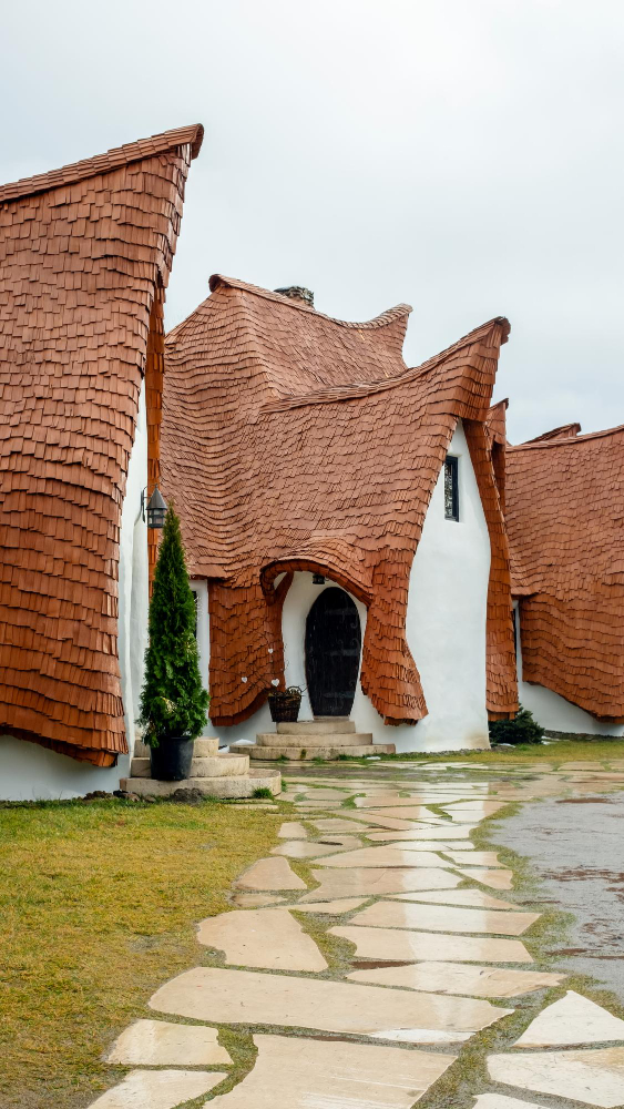 Architecture: Between Fantasy and Reality – Anyone seeing the castle for the first time inevitably feels transported into the world of fairy tales and legends. The irregular, curved shapes of the buildings are reminiscent of Hobbit houses from “The Lord of the Rings” or elven dwellings from fantasy novels. The facades look like sculptures cast from a single mold—an effect that is particularly emphasized by the use of clay. The castle consists of several towers that rise toward the sky like oversized mushrooms, as well as slanted window frames and curved roofs that seem to defy all geometric logic. Each room is individually designed and exudes an atmosphere reminiscent of old folk tales. The harmony between the natural materials and the imaginative architecture gives the castle its unmistakable aura.