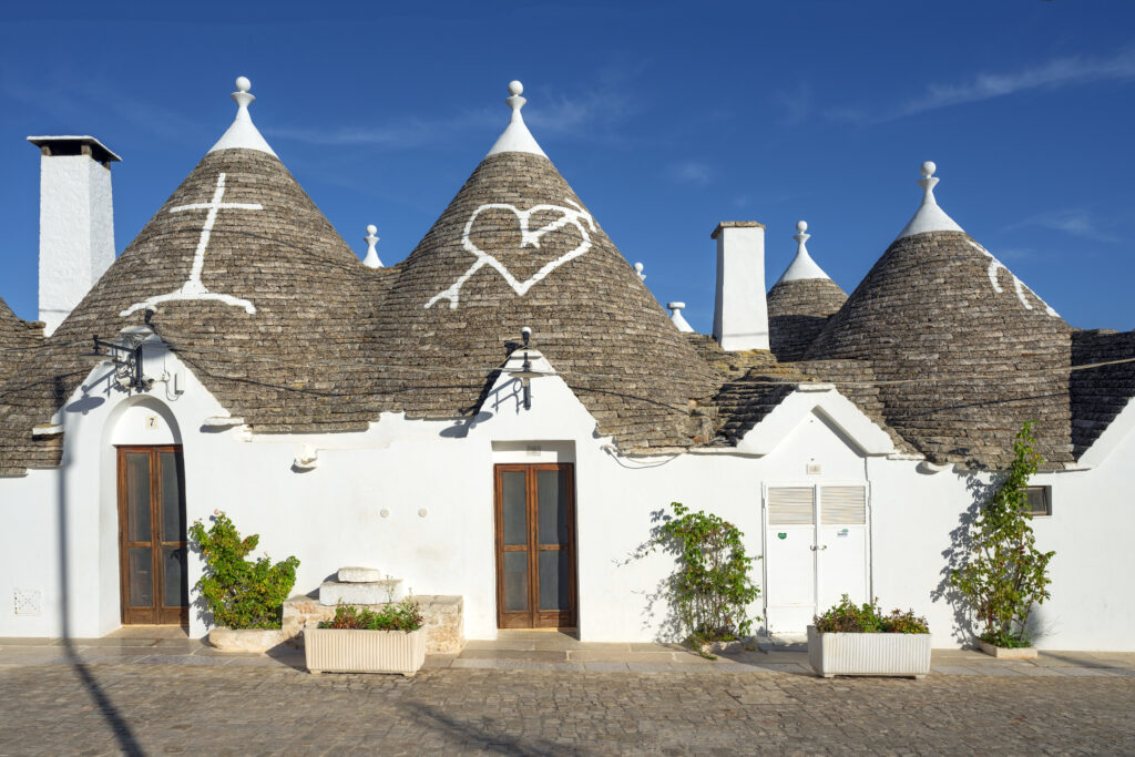 A particularly fascinating legend says that the trulli were built by elves who came to Alberobello on a balmy summer night. These magical beings wanted to help the people and built the houses as safe havens where the inhabitants could feel protected from evil spirits and the forces of nature. In fact, many of the trulli are painted with mysterious symbols—suns, crosses, and hearts—which are said to ward off evil and bring good luck. Whether you believe in these legends or not, one thing is certain: the trulli exude a mysterious magic that is hard to deny.