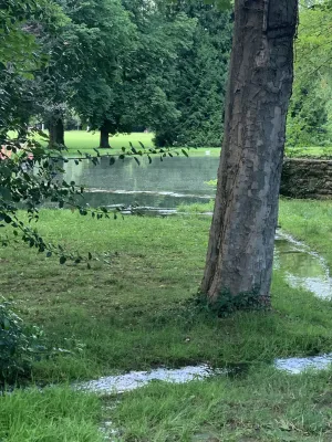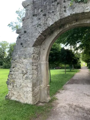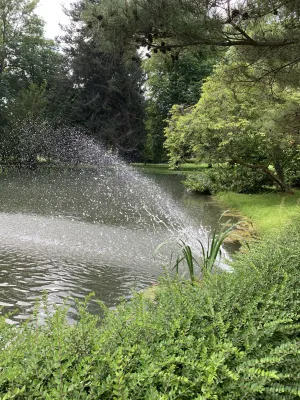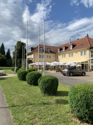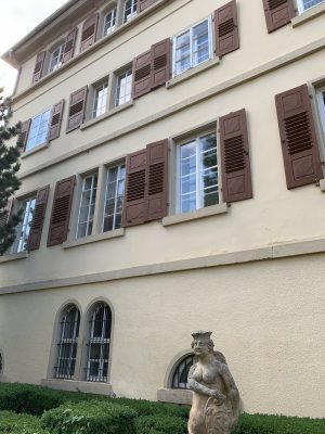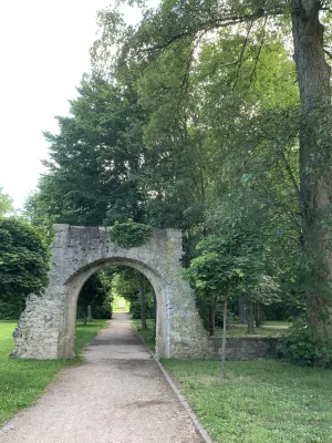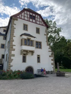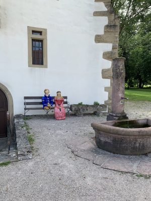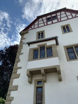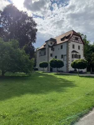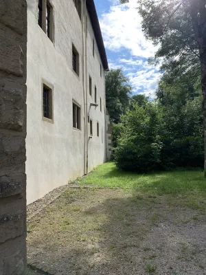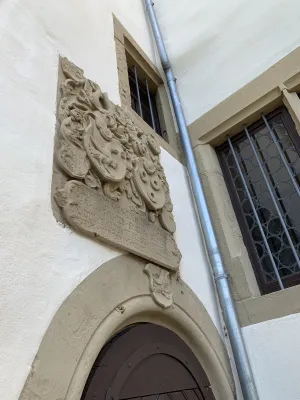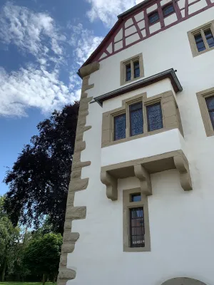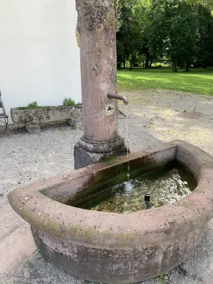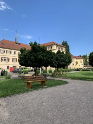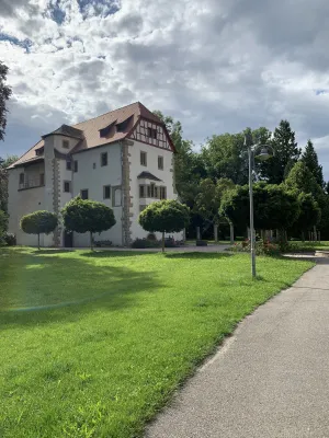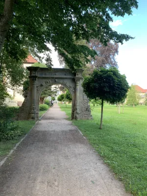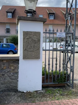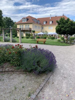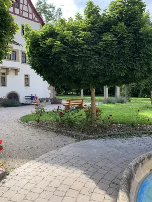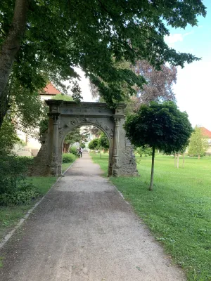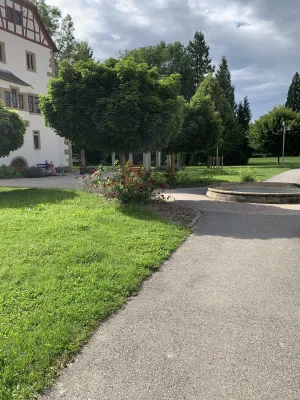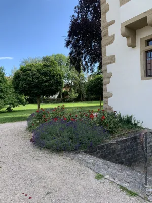 The idyllic castle park at the end of the former old town of Neckarbischofsheim is a true local recreation oasis. The 2.6-hectare castle park surrounds the New Castle, built in 1829, which houses a castle hotel with a restaurant, as well as the Old Castle, also known as the Stone House. The Old Castle was built in 1368 as a palace and is the only surviving building of the former castle complex. Its stair tower was built in 1546. The frescoes in the Knights’ Hall also date from the Renaissance period. During the Thirty Years’ War, it was the headquarters of the famous general Tilly, who led his siege of Heidelberg from this location. After the Bischofsheim line of the von Helmstatt family died out, the building became the property of the city in 1975. Today, the building houses a wedding hall and a local history museum in the Knights’ Hall. During my walk through the castle grounds, I passed the Old Castle, which I consider to be the most beautiful building on the estate. Its corner blocks and the stair tower on the south side are particularly worth seeing. Above the stair tower is the alliance coat of arms of the Helmstatt and Neipperg families. As I continued on my way towards the park, I discovered the magnificent lake, which was part of the former moat. Not far from the lake is a magnificent Renaissance gate from 1590, built by the sculptors Adam Wagner and Jakob Müller. The park used to serve as a defensive structure. Today, it is a beautiful park with extensive green spaces, numerous park benches, beautifully landscaped gravel paths, and gorgeous rose bushes. The restaurant in the castle hotel also caters to your culinary needs. I enjoyed the trip to this green paradise with its huge trees and lavender bushes teeming with bumblebees.