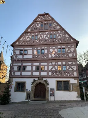 The Hornmold House, located in Bietigheim’s historic old town, is one of the most beautiful Renaissance town houses in southern Germany and was actually almost demolished. The story begins when Sebastian Hornmold, bailiff and first church council director in Württemberg, built his residence and official seat there in place of a benefice house on the Johannespfründe. The remains of the Johannespfründe house, which Duke Ulrich confiscated when the Reformation was introduced in the Duchy of Württemberg and gave to Sebastian Hornmold as a token of gratitude for his services, can still be seen today in the late Gothic remains on the northwestern ground floor. The beautiful house with its early modern half-timbered façade decorated with curved St. Andrew’s crosses served Sebastian Hornmold, his wife Anna, and their six children as a residence and business premises for many years. The summer room with its figurative murals and confessional satires served as a room for leisure. The cellar was used as a wine store. This was because the wine trade provided a lucrative additional income. After the family moved away from Bietigheim, the house continued to be used as a residence. Despite modernization in 1626, it fell into disrepair and was eventually slated for demolition. Thanks to the courageous efforts of a group of Bietigheim citizens in the 1970s, this fate was averted. After extensive renovation from 1976 to 1986, it has housed the city museum since 1989, where the history of the city and its surroundings from the Neolithic Age to the 20th century is brought to life for everyone on around 400 square meters. In addition, since 2017, the Hornmoldhaus Friends Association has been committed to preserving and promoting the future of this valuable cultural asset with its beautiful decorations and paintings inside the house and its magnificent half-timbered structure. The Hornmoldhaus, which can be visited free of charge, offers a permanent exhibition on the history of the city, as well as annually changing special exhibitions and active cultural education.