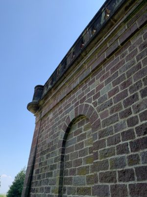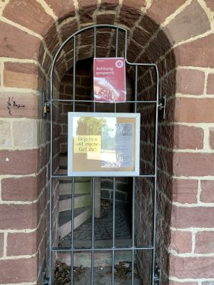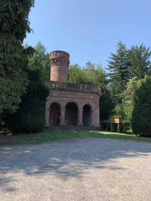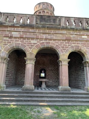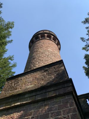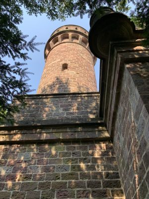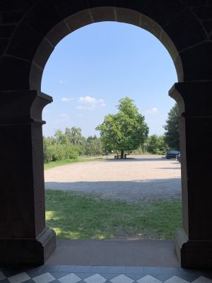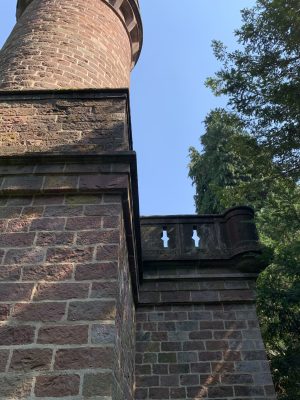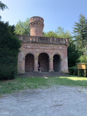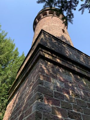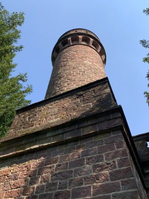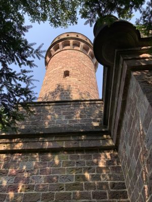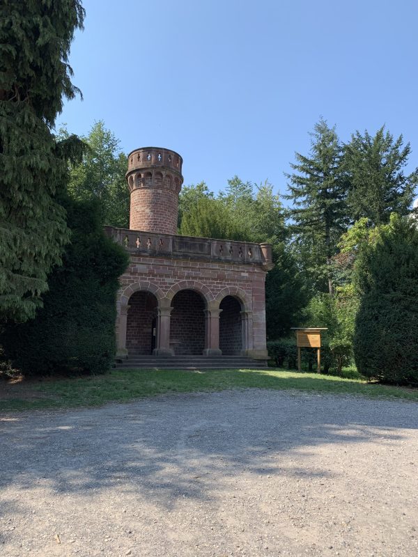 A small pleasure palace with turrets made of red Neckartal sandstone is located on the slope of the Königsstuhl, a mountain over 560 meters high in the Odenwald. This fairytale gem was donated to posterity by Heidelberg city councilor and pharmacy professor Dr. Louis Posselt. In his will, he stipulated that a “viewing tower and pleasure house” should be built after his death. After Posselt’s death, a narrow tower in the early Renaissance style with an open three-arched porch and viewing platform was built, which could be used as the perfect backdrop for numerous knight films. Posselt, who was born in Heidelberg in 1817, spent 10 years in exile in Mexico after the failure of the Baden Revolution. There, the trained pharmacist worked as a mining expert. After returning to his old home, he was appointed professor of pharmacy in Heidelberg in 1860. He also followed in his father’s footsteps and became a city councilor. The pleasure palace was built according to the plans of Heidelberg’s city architect Gustav Schaber and was inaugurated on the first anniversary of its founder’s death on August 21, 1881. Between 2008 and 2009, the city of Heidelberg carried out extensive renovation work, which was financially supported by the German Foundation for Monument Protection. I visited this small pleasure palace with its observation tower, known as the Posseltslust and named after its founder, in tropical temperatures. Idyllically located in Heidelberg’s city forest, I was able to view this building, which was built for relaxation and contemplation, up close. After crossing a gravel forecourt, I came to the vestibule with its three round arches and a round stone table in the center. Behind it, I discovered the entrance to the 15-meter-high round tower. A spiral staircase leads both to the terrace on the flat roof of the loggia and to the platform on the tower, which are secured by sandstone armor with keyhole-shaped decorative openings.