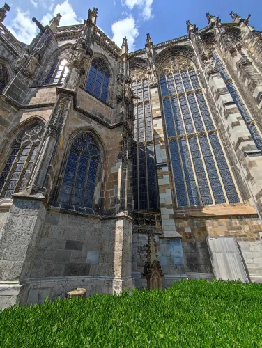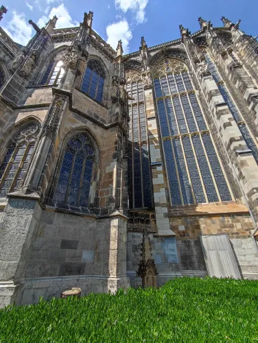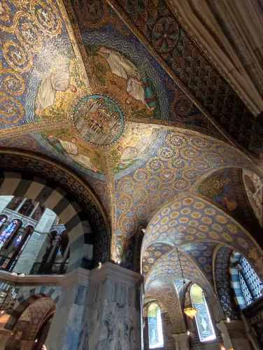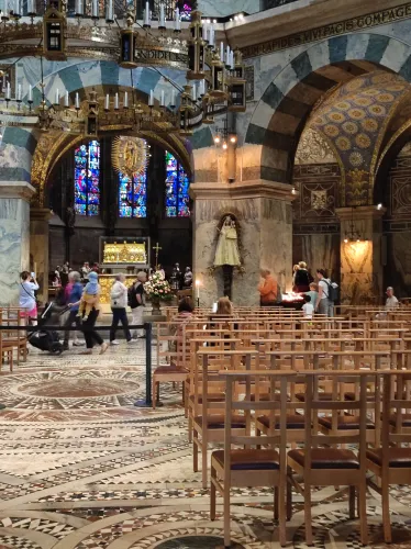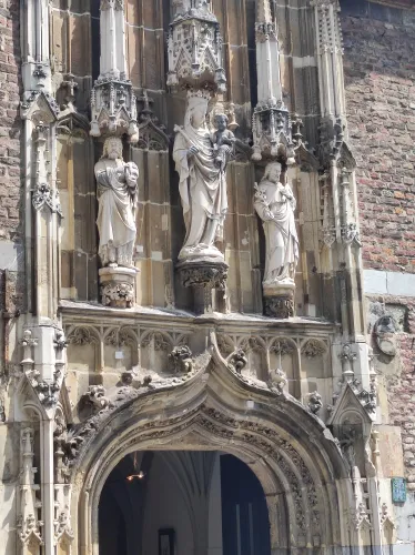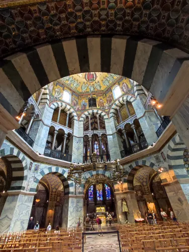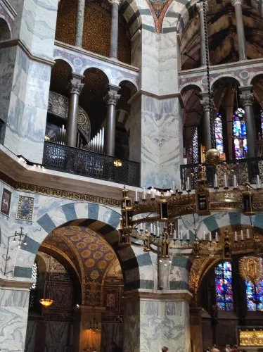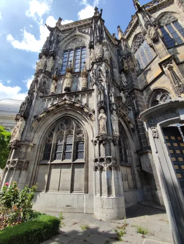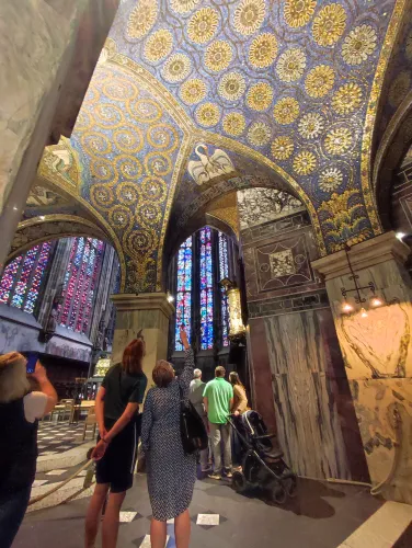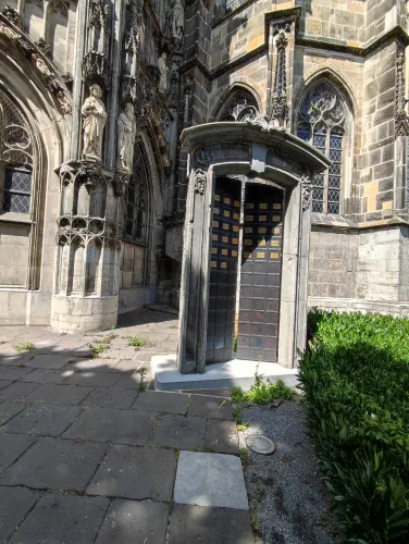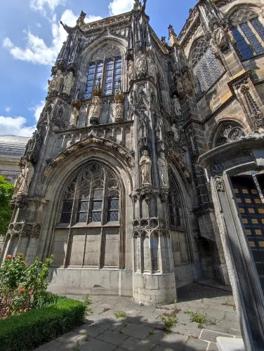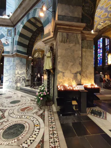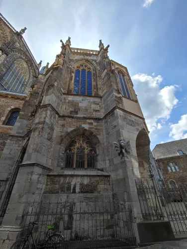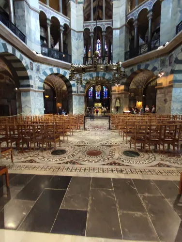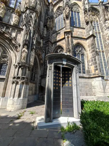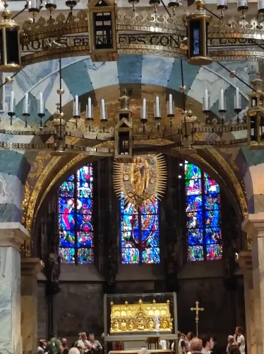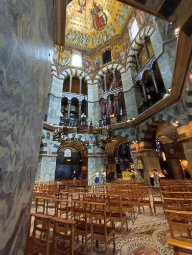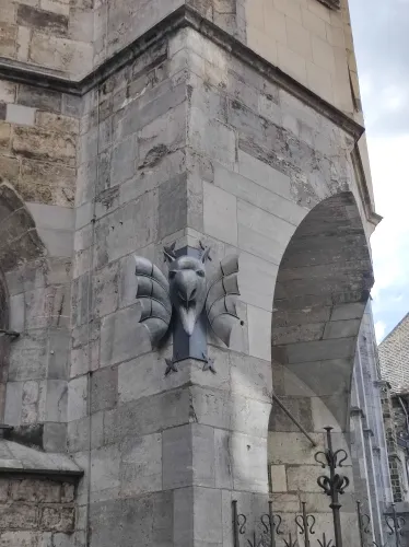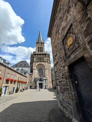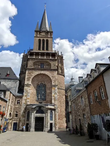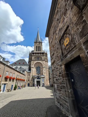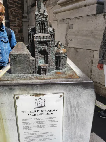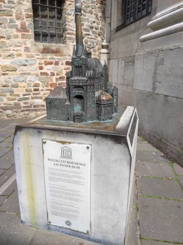 The landmark of the North Rhine-Westphalian city of Aachen, located in the border triangle of the Netherlands, Belgium, and Germany, is its magnificent cathedral in the heart of the old town. Emperor Charlemagne had it built around 800 as an important palace with a palace chapel, today’s Aachen Cathedral, at its center, based on Byzantine models, where he also found his final resting place. The palatine church of Charlemagne, the Carolingian octagon, was the highest domed building north of the Alps when it was built, at 32 meters, and almost all German kings, 30 in total, were crowned there between 936 and 1531. The Carolingian throne in the gallery still commemorates this today. Not only were 32 million mosaic stones used in its construction, but the windows in the choir hall cover an area of no less than 1,000 square meters. The cathedral is not only the bishop’s church of the Diocese of Aachen, but has also been an important place of pilgrimage since the 13th century. This is because the relics of Mary’s dress, Jesus’ swaddling clothes and loincloth, and John the Baptist’s execution cloth are kept in the Shrine of Mary in Aachen Cathedral. These are displayed every seven years in Aachen Cathedral and on the Katschhof during the Aachen Pilgrimage. The cathedral treasury next to the cathedral houses the cathedral’s church treasure, which is one of the most important ecclesiastical cultural treasures in the world. Due to its architectural and art-historical significance, Aachen Cathedral was the first German cultural monument to be included in the UNESCO World Heritage List in 1978. An ancient legend surrounds this imperial cathedral in Aachen, which is over 1200 years old. Emperor Charlemagne wanted to build the most beautiful and largest church north of the Alps at his headquarters in Aachen. No expense or effort was spared in the construction of the church. When Charlemagne had to go to war against the Saxons, the city council was entrusted with supervising the construction of the church. But the city ran out of money, so in their desperation they begged the devil himself for help. He promised to help if, in return, he received the first soul to enter the cathedral. The city council made a deal with the devil, and the cathedral was soon completed. Charlemagne was overjoyed. But the city council was worried, because Pope Leo III, as the highest-ranking clergyman, would be the first to enter the cathedral to consecrate it. How could they prevent this? Then a monk had a clever idea of how they could outwit the devil. Since the devil had not explicitly specified that the soul had to belong to a human being, the soul of an animal could also be sacrificed. Therefore, a wolf was the first to enter the cathedral, where the devil was already lurking behind the entrance, waiting for the soul he had been promised. When he pounced on the wolf, believing it to be Pope Leo III, he realized he had been tricked. Beside himself with rage, he wanted to bring down the cathedral. He struck the portal with all his might, causing it to crack and leaving the devil’s thumbprint imprinted on it. This can still be felt on the door knob of the cathedral today. The bronze figures of the wolf and its soul in the vestibule commemorate this legend, which I was also able to admire during my visit to the Imperial Cathedral.