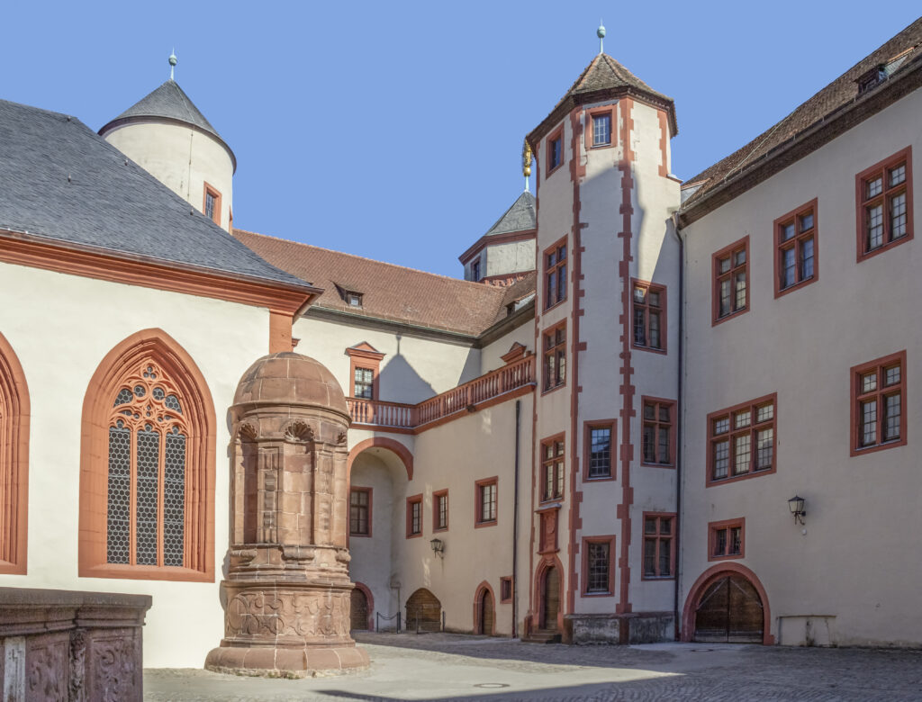 The Peasants’ War: An unprecedented siege. In 1525, during the German Peasants’ War, the fortress became a focal point of the conflict. The supporters of Bishop Konrad II von Thüngen retreated to the fortress amid the chaos that engulfed the diocese of Würzburg. Despite a lack of military organization, the peasant uprising suffered a crushing defeat at the gates of Würzburg. The commander of the fortress during the siege was Provost Margrave Frederick of Brandenburg, who strategically deployed 18 troops across various parts of the fortress. With around 400 men, including such well-known figures as Count Wolf von Castell and Canon Hans von Lichtenstein, the fortress garrison bravely repelled the peasants’ attacks. Today, a small monument on the Tellsteige on the slope of the Marienberg commemorates the farmers’ cause. Tilman Riemenschneider, a member of the city council who had sided with the farmers, was held captive in the fortress for six weeks after the uprising failed. The historic Hof zum Stachel inn in Gressengasse, marked by its distinctive morning star coat of arms, served as a meeting place for rebellious citizens and peasants.