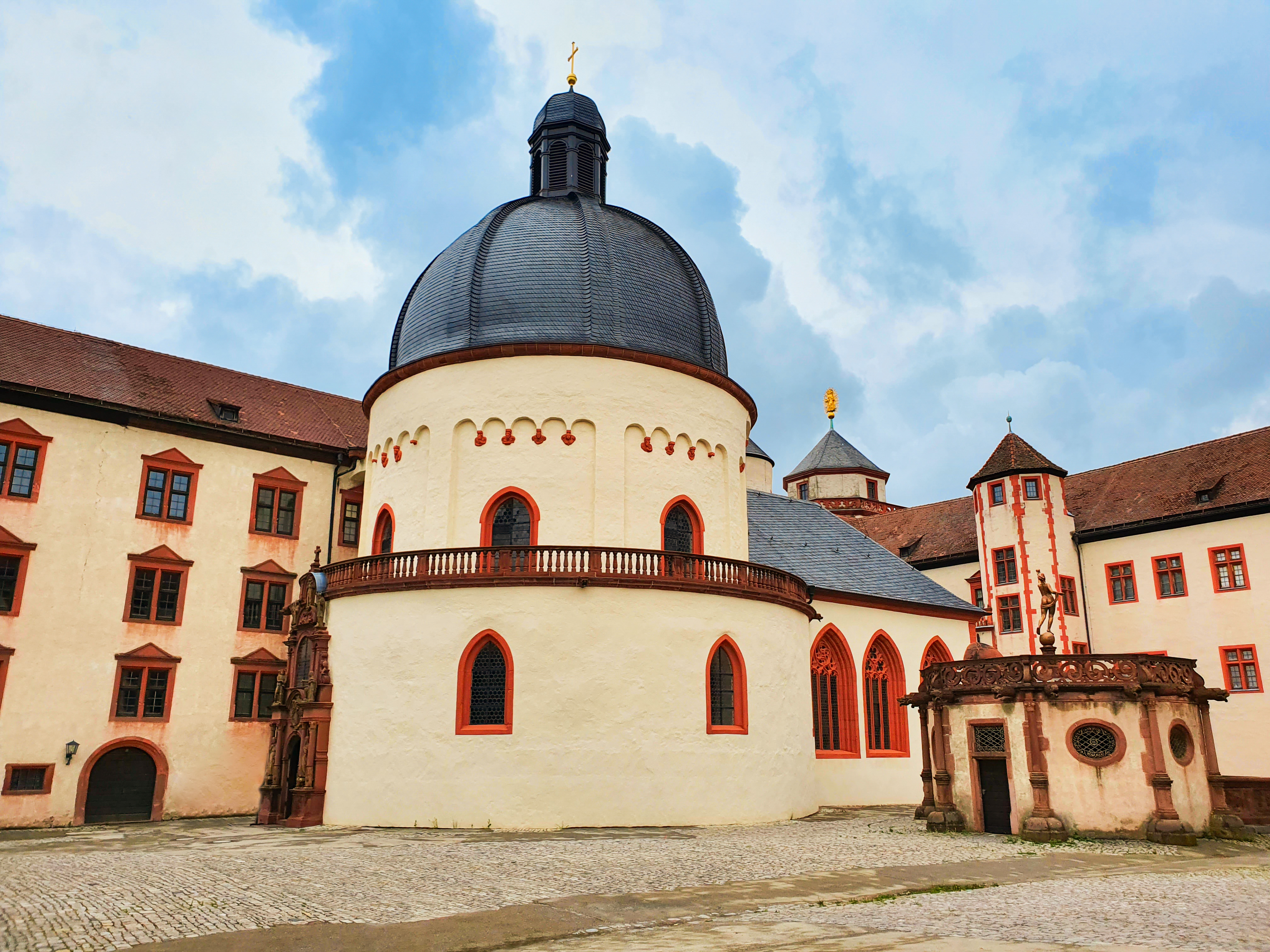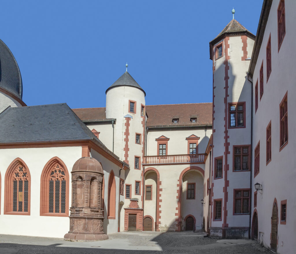 Medieval changes: From castle to fortress. Over the centuries, the Marienberg Fortress was renovated and expanded several times. The oldest surviving parts date from the early 11th century, including the small St. Mary’s Church. From the late 11th to the 13th century, members of the Henneberg family served as burgraves of Würzburg. Around 1200 AD, a castle with a keep and a deep well was built, known as the palace of Konrad von Querfurt. From 1253 to 1719 AD, the fortress served as the residence of the prince-bishops of Würzburg and witnessed political and military unrest, including the infamous Peasants’ War.